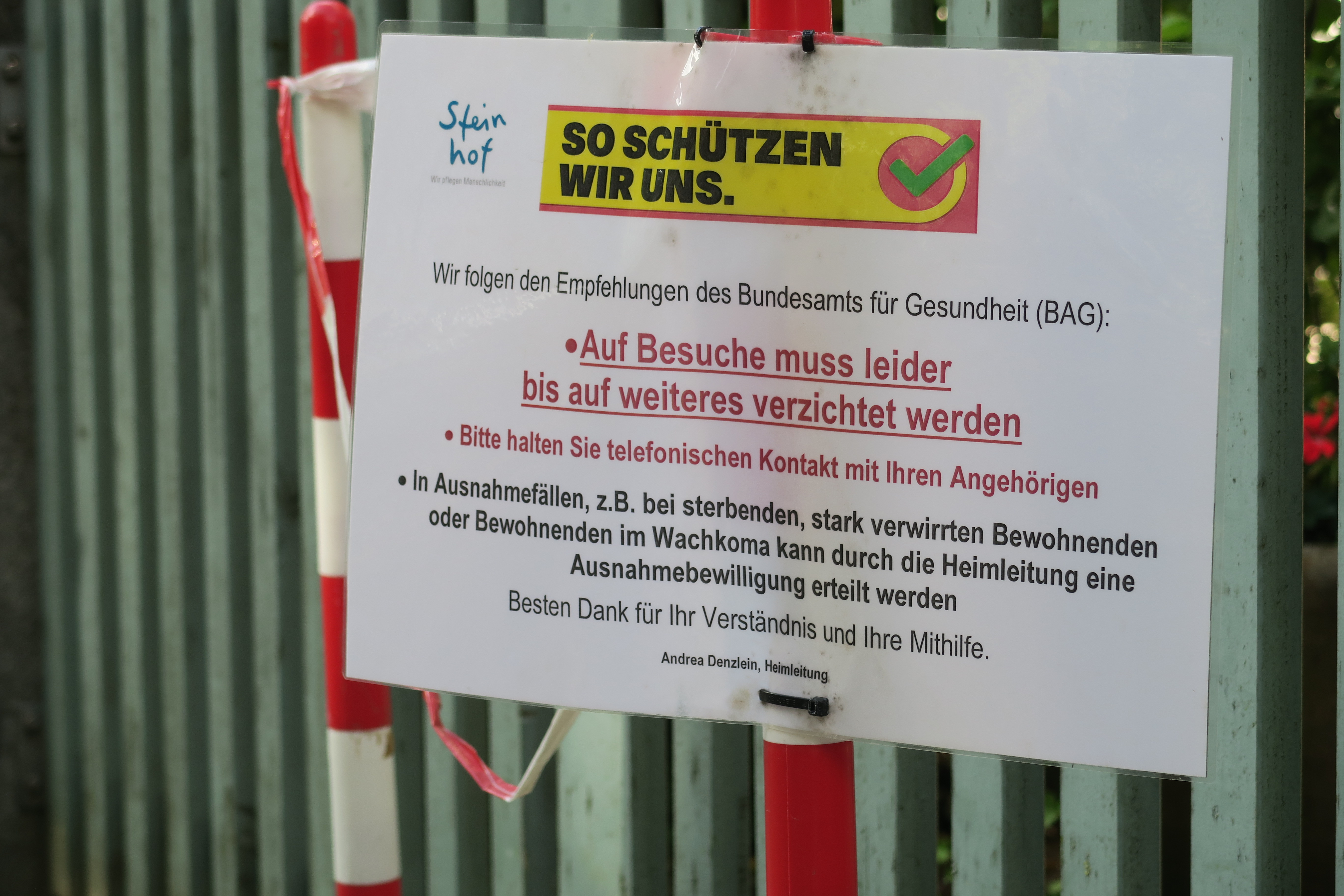 Noch sind die Türen des Pflegeheims Steinhof in Luzern mit rund 100 Bewohnerinnen und Bewohnern für Aussenstehende geschlossen. Doch sind Angehörige seit dem 4. Mai 2020 herzlich willkommen, ebenso wie die Journalistin. Beim Eingang liegen neben dem Meldeformular für Besucherinnen und Besucher auch Masken und Desinfektionsmittel bereit. Beim Gang durchs weitläufige Haus herrscht eine ruhige, friedliche Atmosphäre. Einige Frauen und Männer sind zu Fuss oder im Rollstuhl unterwegs. Andere sitzen still da, oder sie sind in eine Zeitung oder in ein Kreuzworträtsel vertieft.