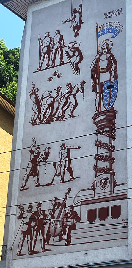 Auf der anderen Strassenseite döst das geschlossene Restaurant «Untergrund» vor sich hin. Der Flaneur erinnert sich an die tote Bärin aus dem Basler Zoo, die 1962 tiefgefroren vor dem Eingang hing. Zwei Tage später wurde ihr zum Gaudi der Klientel das Fell über die Ohren gezogen, der Protz zerlegt, gebeizt und gewürzt, gebraten und geschnitten am Tisch serviert. Das Wandbild am Haus erinnert an die Arbeit der Steinhauer im einstigen Steinbruch dahinter. Die Männer pickelten jahrzehntelang am Felsen unter dem Gütsch, es war der grösste Steinbruch in der Stadt. Signiert ist die dem Steinmetzen-Patron Sankt Reinold gewidmete Darstellung mit «HZ» und «HB». Es handelt sich um den Künstler und Kunstgewerbler Hans Zürcher und Malermeister Heini Bühlmann.