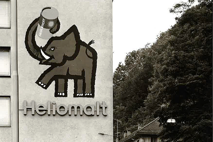 Die letzten Erinnerungen des Flaneurs vor Ort aus seinen Anfängen an der «Kanti»: An der ersten Hausfassade über der Bushaltestelle stadtauswärts prangte der vom bekannten Schweizer Grafiker Celestino Piatti entworfene «Heliomalt-Elefant». Der Dickhäuter trug im hoch gereckten Rüssel eine Büchse des Getränkepulvers. Die Werbung versprach: «Heliomalt gibt Kraft für zwei». Daran glaubte ich und fand es nützlich, vor jedem Prüfungstag Heliomalt zu trinken. Zuhause auf dem Hof kam als Stärkungsmittel nur Heliomalt, nicht aber Ovomaltine in Frage. Denn Heliomalt wurde von der Milch-Gesellschaft, «Südi» genannt, im nahen Hochdorf produziert. Ovomaltine stammte aus dem protestantischen Bern, wo die Kühe nicht braun, sondern gescheckt waren.